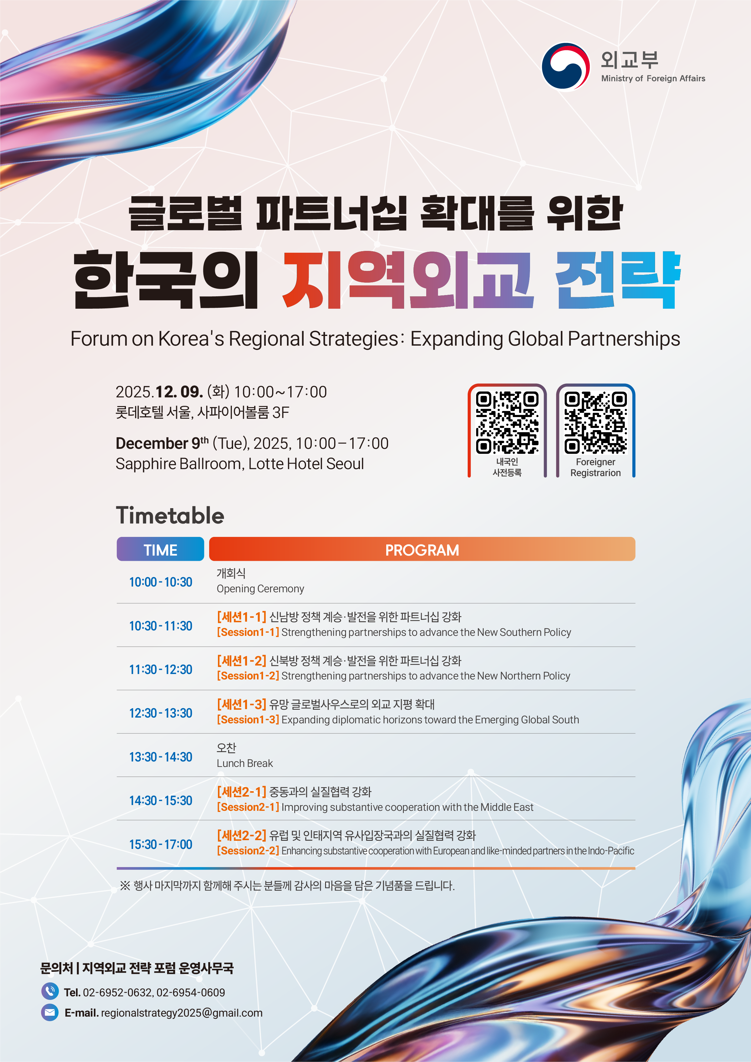 외교부는 12월 9일 '글로벌 파트너십 확대를 위한 한국의 지역외교 전략 포럼'을 개최합니다.