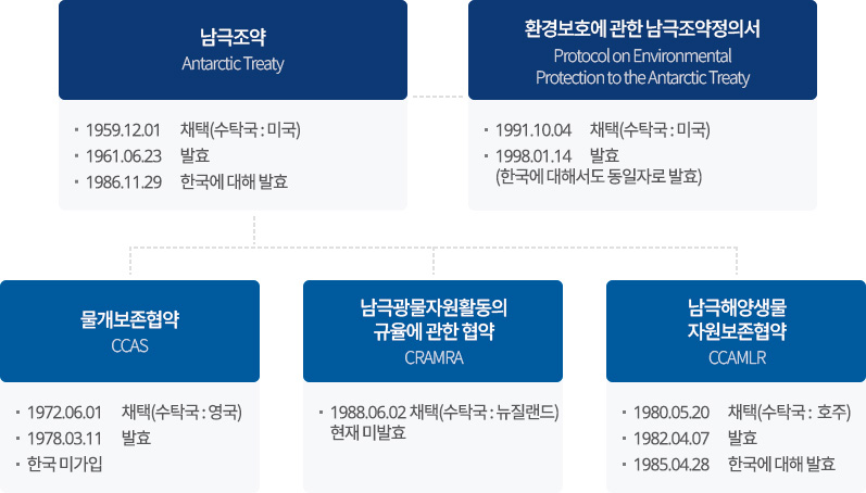 ‘남극조약체제’란 1959.12.1일 채택되어 1961.6.23일 발효한 ‘남극조약’(Antarctic Treaty)을 정점으로 하여 해양, 광물, 환경 등 각 분야별로 체결된 조약들이 포괄적으로 하나의 집합체를 형성한 것을 의미합니다.